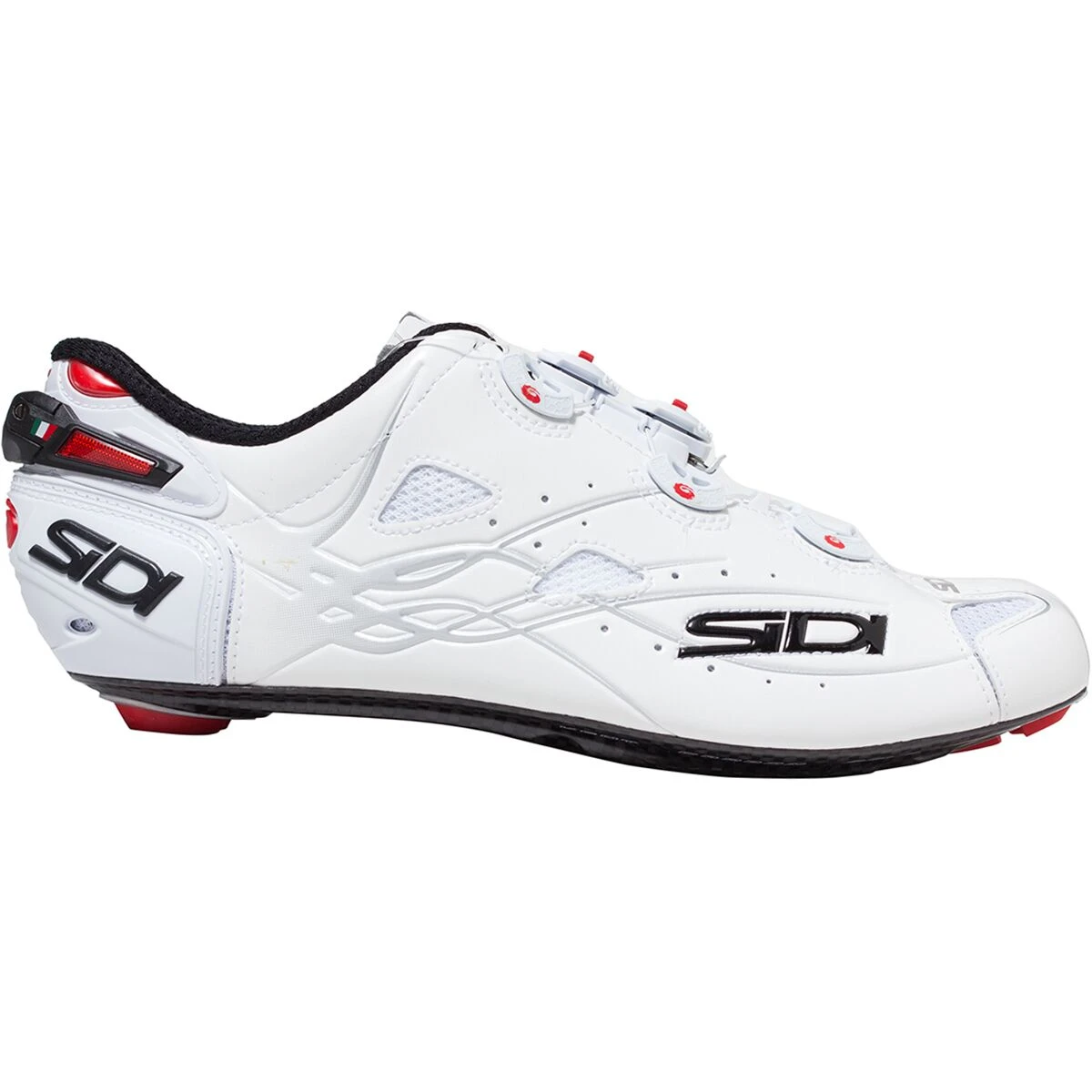 The Shot stands alone as the only shoe in Sidi’s line to embrace the symmetrical closure system of central dials rather than dials offset on the outside of the foot. The effect pulls the upper from both sides, enveloping the foot in a cocoon of Microfibra Techpro rather than pulling the material over the top from the instep. The closure system also makes the Shot Sidi’s cleanest shoe, both aesthetically and when it comes to aerodynamics. Fewer bulky protrusions make for a more minimalist silhouette than what we’re used to from Sidi, and less protrusion also means fewer transitional ridges to catch the air and slow you down.