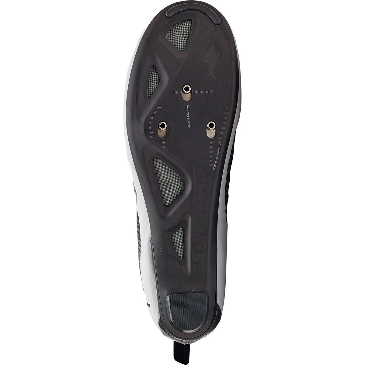 To get the weight down to the 150g mark per shoe, Specialized employs Finite Element Analysis and pressure mapping to shave all unnecessary material from the carbon sole while maintaining a high level of stiffness and pedaling efficiency. For the uppers, space-grade Dyneema mesh is used which is incredibly strong and lightweight and won’t deform or stretch under power. The heel cup is removed to save even more weight, replaced by CubicTec reinforcements that mold to your heel to prevent slippage. The toe box is also removed, replaced by a Warp Sleeve vamp that not only sheds grams but also improves comfort in the forefoot area.