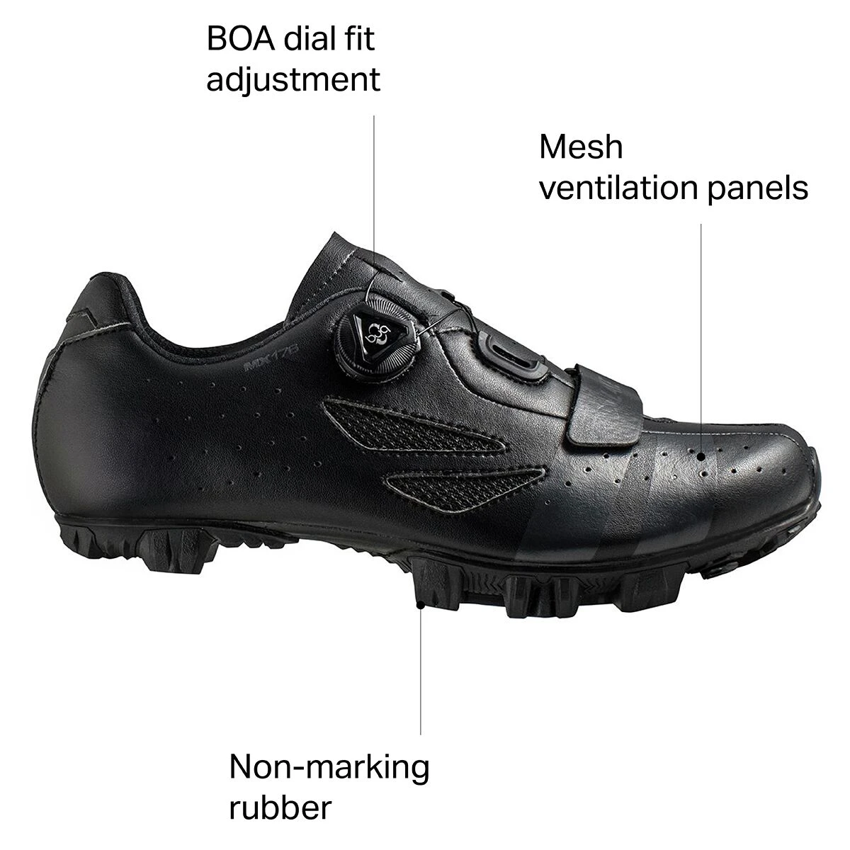 Lake uses its Race Sole to transfer the power to the pedals and covers it with its Mountain Race X non-marking rubber outsole for grip anytime you are off the bike. The Clarino microfiber upper is soft and durable while its mesh panels keep your feet from overheating on long rides. The closure system consists of a side mounted push/pull BOA L6 lacing system up top with a hook-and-loop strap closer to the toes. The BOA uses a micro-cable that provides fine-tuning and evenly-distributes the closure eliminating pressure points and hot spots.