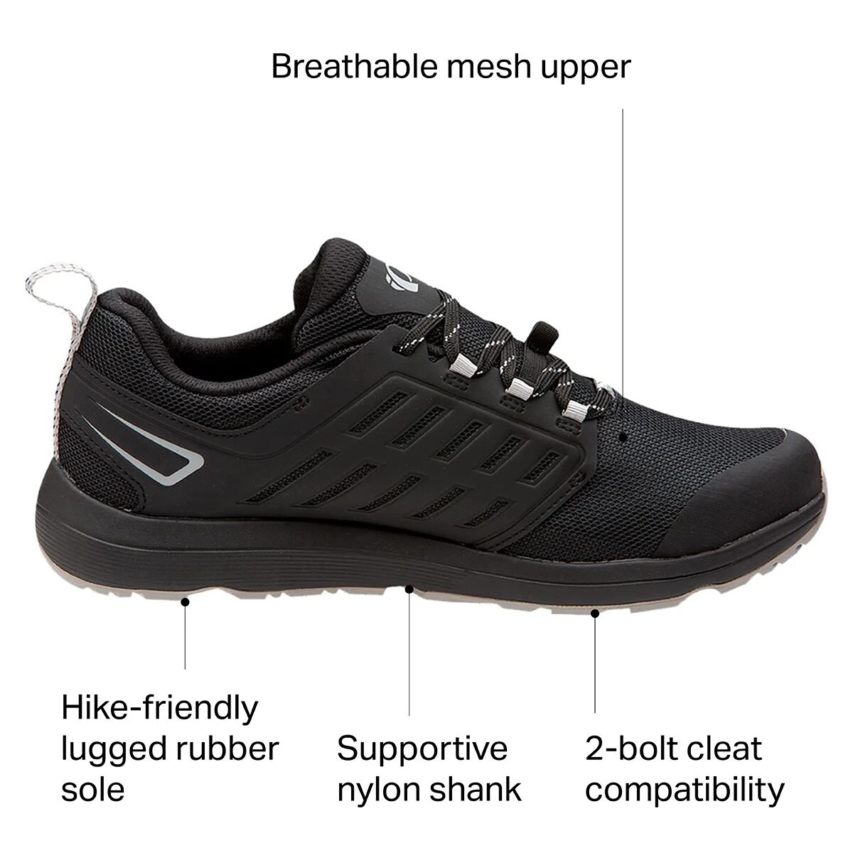 The X-ALP Canyon shoes feature a bonded synthetic top with ample mesh panels that keep your feet from baking on hot trails. They are low-cut at the ankle to provide a light and fast fit that allows for natural ankle rotation off of the bike. While flex is good for miles on foot, a stiff sole is a must for power transfer on the bike, so Pearl equips the X-ALP Canyon’s with a nylon composite shank to maximize power transfer to the pedals, without compromising torsional flex for hiking. Underneath the shank you’ll find a lightweight EVA midsole that cushions your steps comfortably, and a beefy carbon-rubber lugged outsole that provides directional traction on foot. The center of the shoe is ready for clipping in with 2-bolt SPD compatibility that sits recessed and out of the way of your lugs, so your cleats don’t get hung up on rocks when you’re making your way up steep faces.