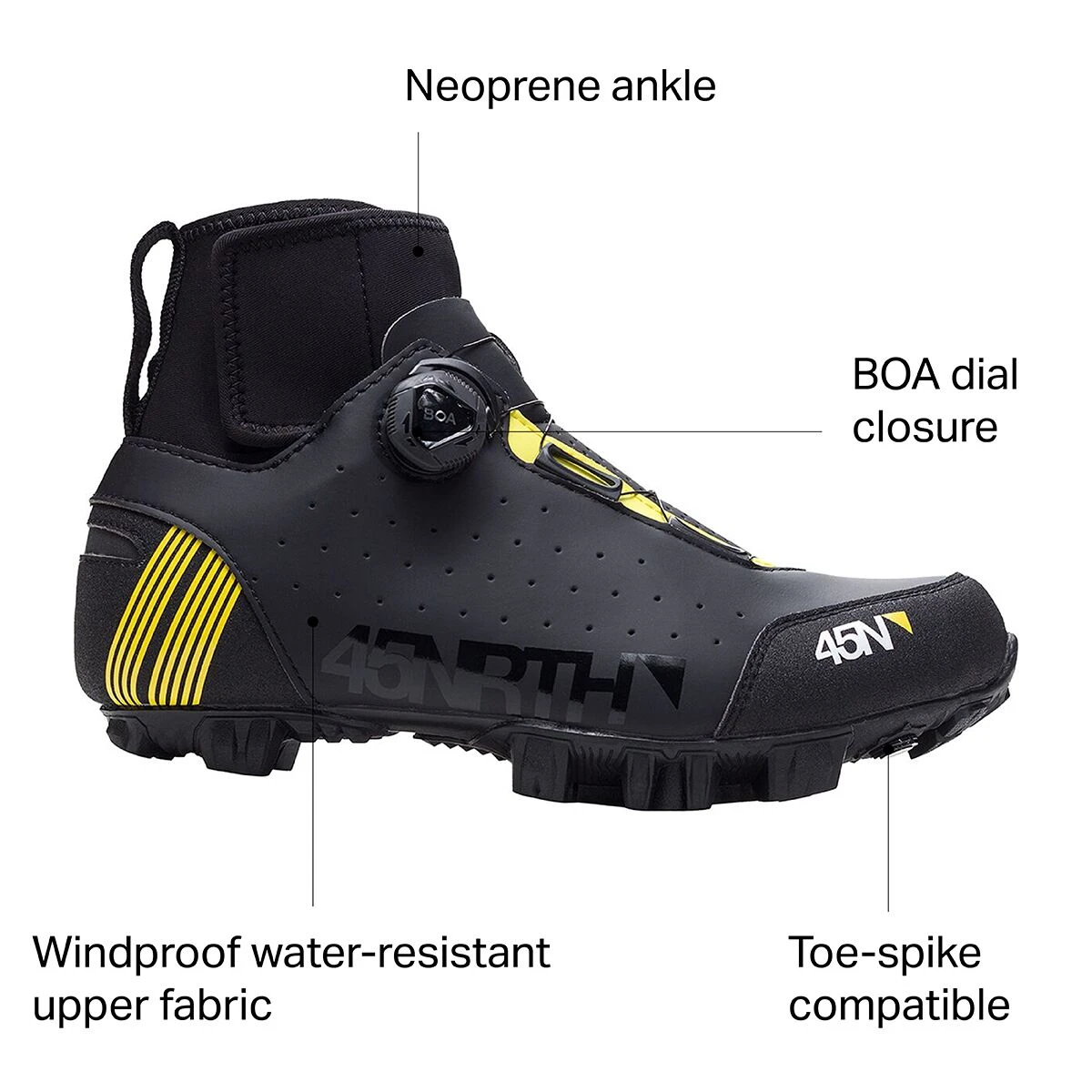 The uppers are joined to a reinforced nylon sole for efficient power transfer to the pedals, and feature a rubber outsole that’s infused with microscopic glass fibers to increase traction on slippery surfaces. The closure system is a micro-adjustable Boa dial that makes it easy to find the perfect fit. Lastly, they are compatible with 2-bolt cleats only, and are recommended for temperatures as cold as 25-degrees Fahrenheit per 45NRTH.