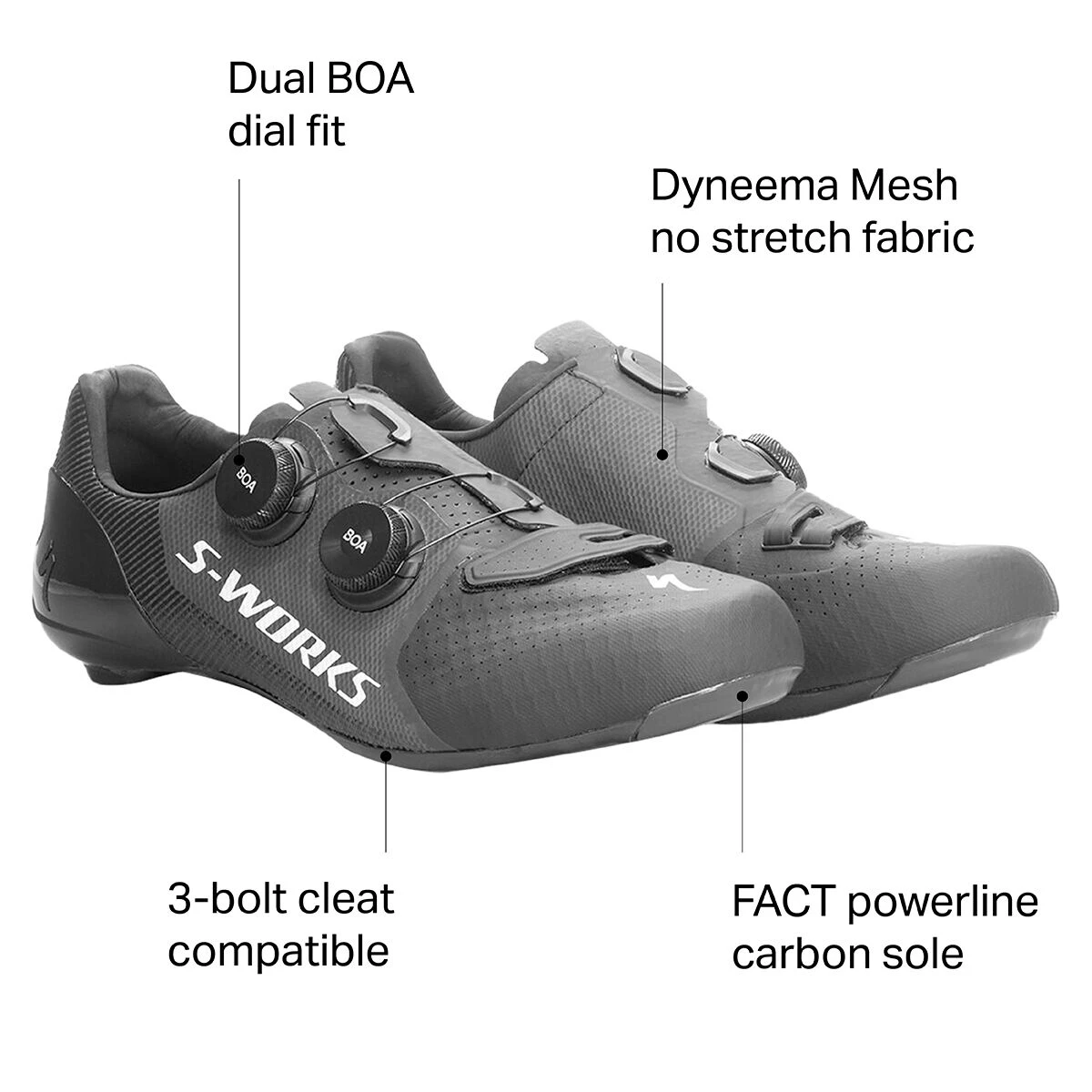 The S-Works 7 series includes the most advanced cycling gear from Specialized, and the S-Works 7 Cycling Shoe strives for perfect road performance without compromising comfort. Made of ply-by-ply carbon originally developed for racing, Powerline is the stiffest, lightest sole from Specialized, and it’s fine-tuned for transferring all the power you push down on those pedals with. The upper is made out of Dyneema Mesh sandwiched between layers of four-way stretch and TPU for flex in key areas and a custom fit.
