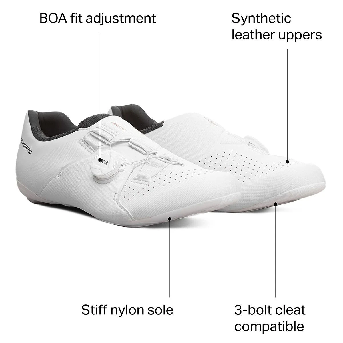 For comfort mile after mile, Shimano integrates the midsole to the upper for a seamless fit and unified form that stabilizes your foot during high power efforts. The RC3 is compatible with 3-bolt cleats for the traditional road pedal platform.
