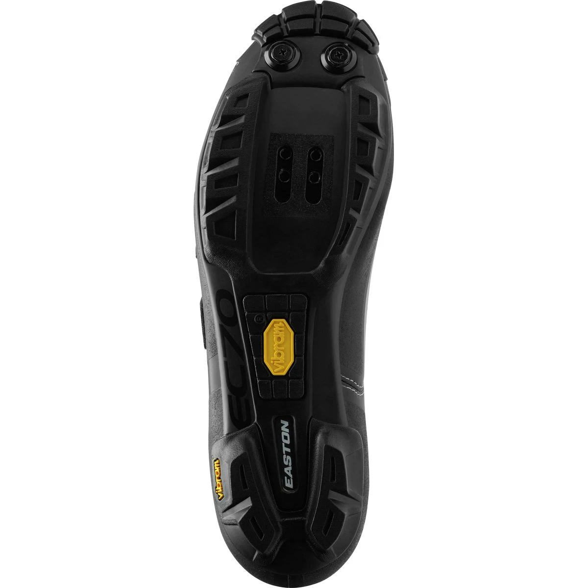 The Easton EC70 carbon composite sole offers pro-level stiffness that remains comfortable on hike-a-bike sections and while running between the barriers. A low, 6.5mm stack height reduces the amount of material between foot and pedal for efficient power transfer and quick clip-ins. The sole is finished with a tough and grippy Vibram rubber outsole that provides protection and traction anytime you’re not clipped in. Each shoe also includes fittings for two toe spikes for extra traction when you really need to dig in.