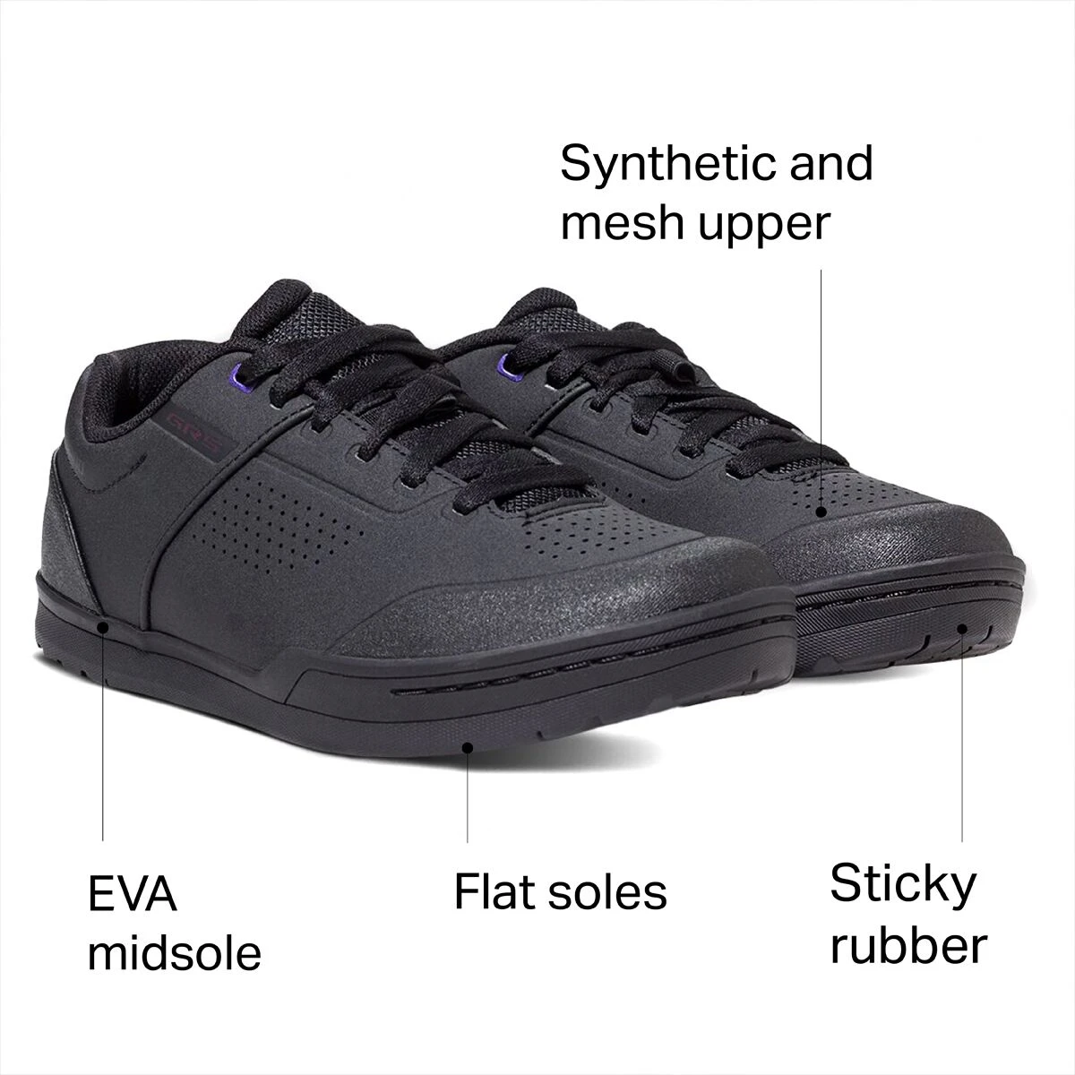The Shimano SH-GR5 Mountain Bike Shoe takes your flat-pedal game to any terrain. With zero cleat attachment real estate on the bottom of the proprietary rubber sole, youβll have an optimum grip on flat pedals and easy walkability for hanging out with the crew post-ride. The sticky rubber outsole provides a tread pattern that works well with pins on the flat pedals for confident stability, as well as keeping you and your bike upright when youβve got to put a foot down in the loose turns. Inside, the optimized shank plate provides plenty of rigidity for efficient power transfer between you and the pedal. An EVA midsole offers cushion to keep your foot comfortable on and off the bike, while the upper part of the shoe allows plenty of airflow to keep your foot from overheating. The easy lace-up style means youβll also have uniform pressure, and can wear tight or loose.