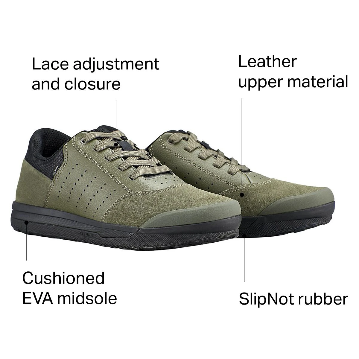 Hunting style and form for the trails and post-ride beverages with the crew gets a major boost with the Specialized 2FO Roost Flat Pedal Shoe. This casually styled platform shoe excels on the rough and rowdy trails and then kicks back for the recovery sessions back in town. With Specialized’s Body Geometry technology, the 2FO is roomy enough for comfort up and down the slopes while offering the tension and support you need for aggressive missions and racing. A durable leather and textile upper meets a brand new SlipNot ST rubber sole that connects for inspired grip on platform pedals in unruly terrain and over challenging downhill obstacles.